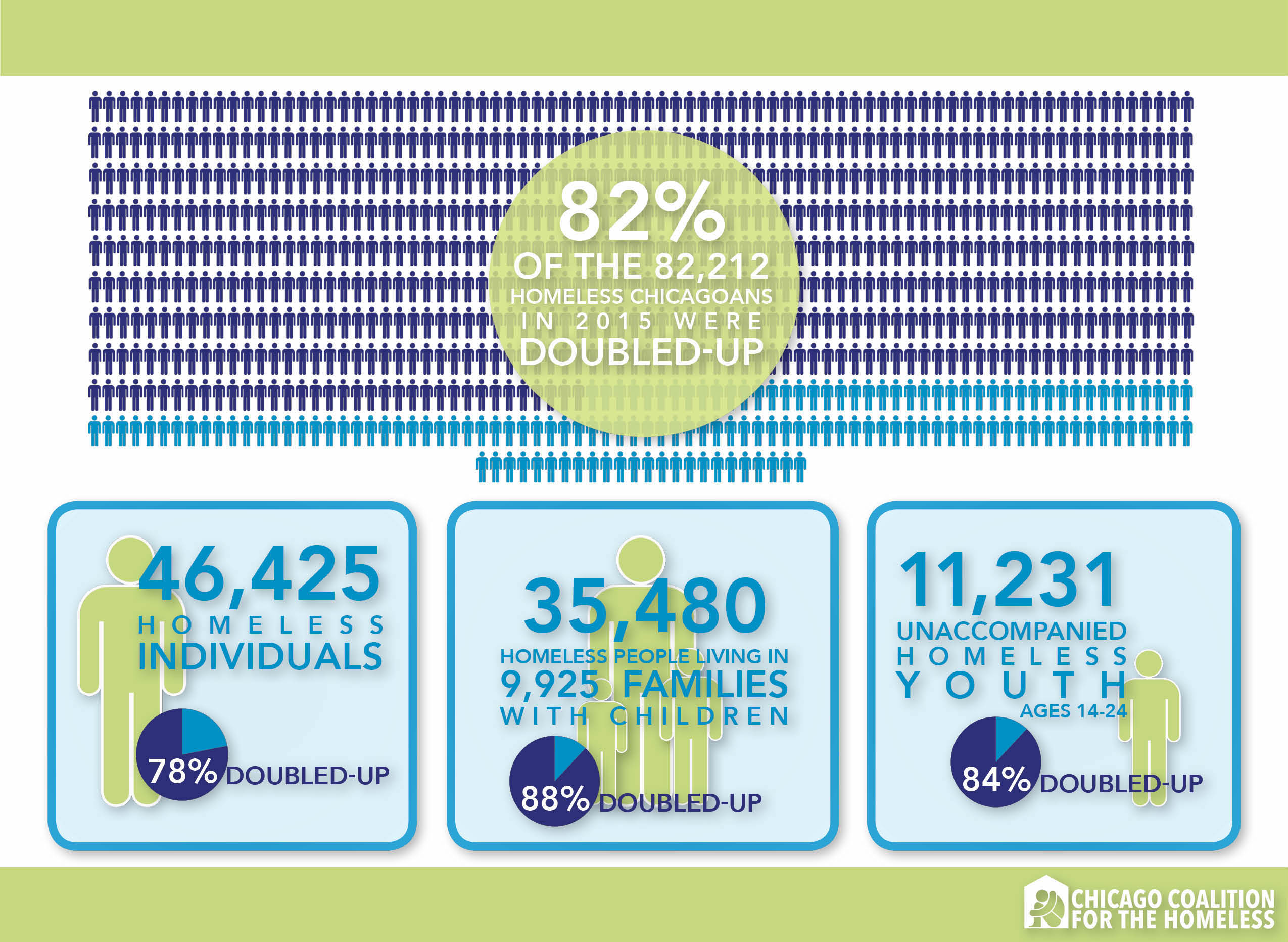 An analysis by Chicago Coalition for the Homeless (CCH) shows that 82% of homeless people in Chicago in 2015 sought shelter with relatives and friends, also known as being “doubled-up.”