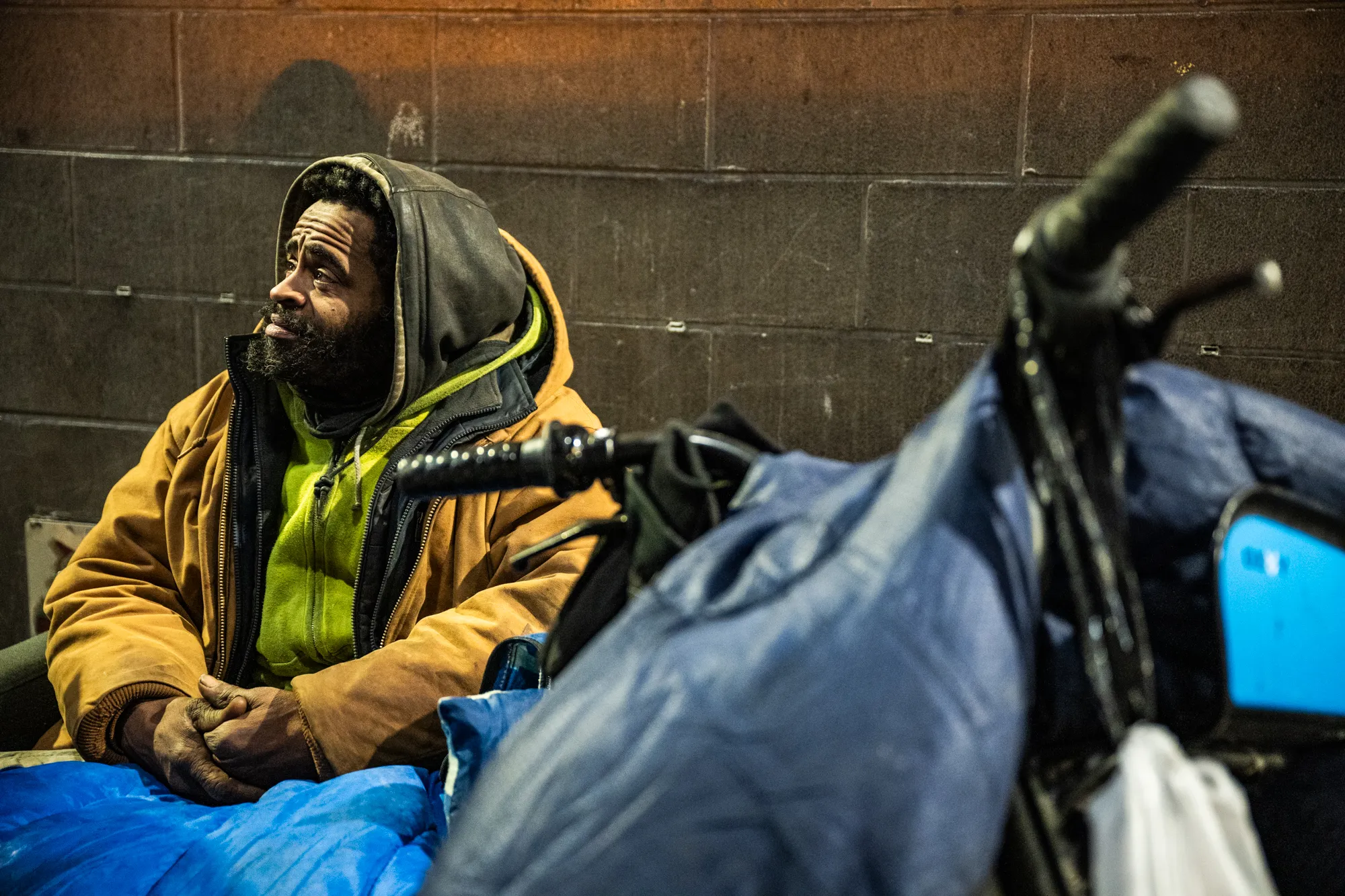 James Orange, an unhoused person, sits on a couch under River East as Chicago’s annual point-in-time count was conducted to assess the city’s unhoused population on Jan. 22, 2026. Credit: Colin Boyle/Block Club Chicago