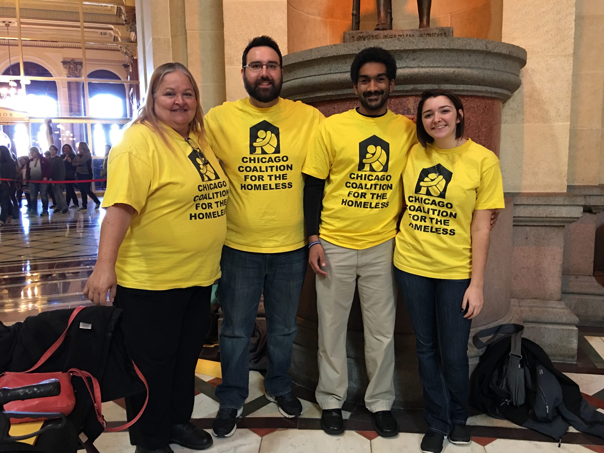 State Network Organizer Jim Picchetti (second from left) with three leaders from Aurora’s Hesed House, in Springfield today with CCH and the Grassroots Collaborative. From left, Janet Ramos, Michael Krueger and Emmie Kearns.