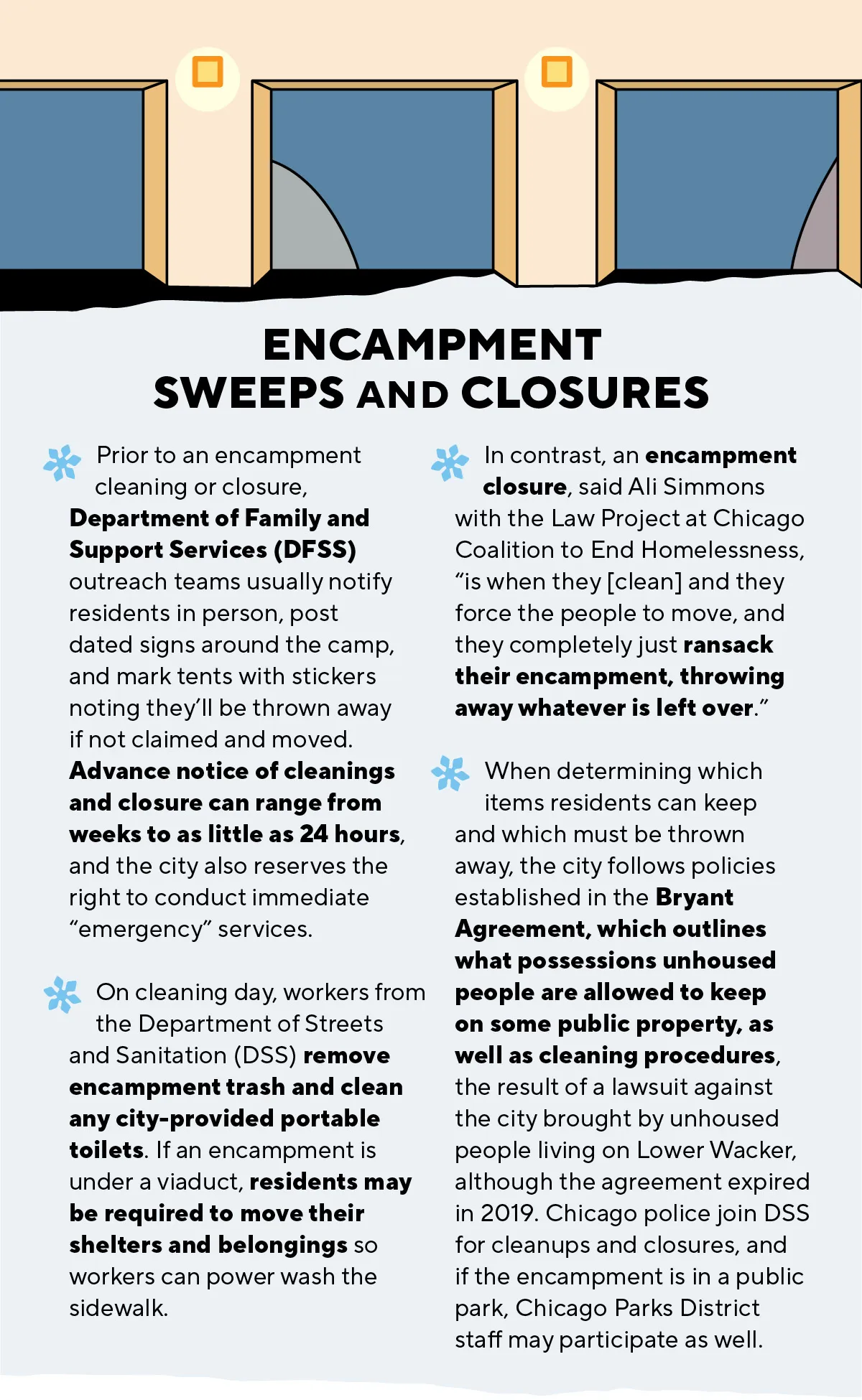 “It serves no purpose,” Ali Simmons, senior case and street outreach worker at the Law Project at Chicago Coalition to End Homelessness said of the evictions. “You close one encampment, you offer no housing. You interrupt services being provided to people.” Outreach workers help unhoused people get copies of their vital records, which are required to obtain housing and jobs. Many residents don’t have phones or regular schedules, so in-person contact is essential to help people move forward in their lives. “When encampments are closed, and we lose contact with the person, we are sitting there with their information and have no way of getting it to them,” Simmons said.