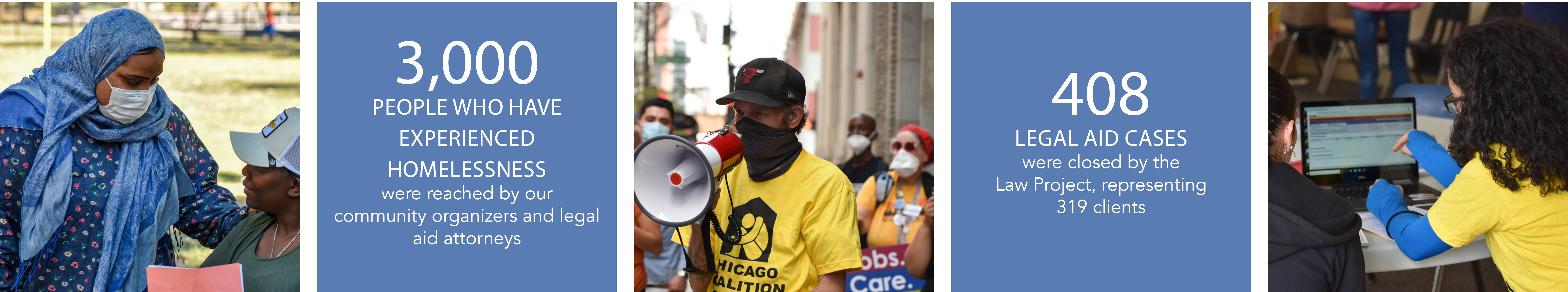 Five blocks in a row. Block 1: Photo of a young woman wearing a hijab, standing, speaking to a Black woman in a trucker hat, seated. Block 2: Blue square that reads: 3,000 people who experienced homelessness were reached by our community organizers and legal aid attorneys. Block 3: photo of a white man speaking to a crowd with a bullhorn. The man is wearing a yellow t-shirt with the Chicago Coalition for the Homeless logo. Block 4: Blue square that reads: 408 legal aid cases were closed by the Law Project, representing 319 clients. Block 5: two young women with brown hair from behind, seated in front of a laptop.