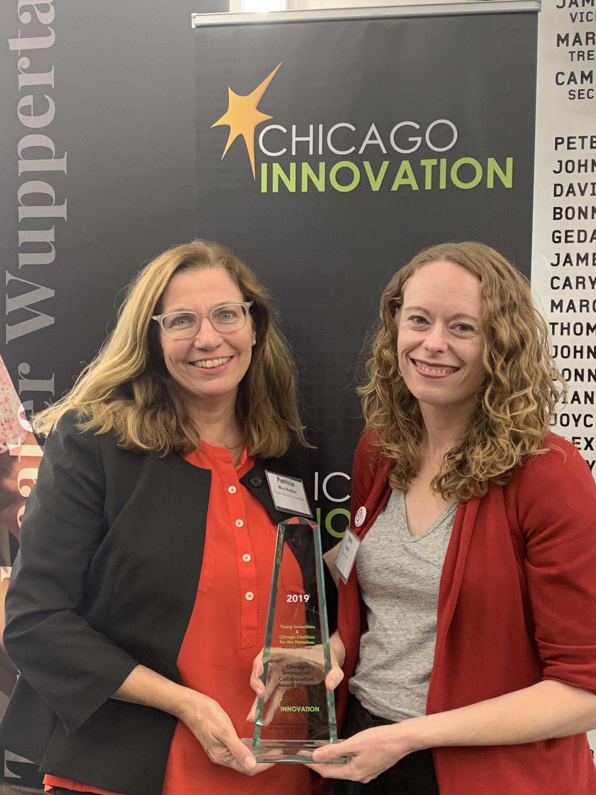 (From left) Patricia Nix-Hodes of the CCH Law Project and Erin Steva of the Young Invincibles accept Chicago Innovation’s 2019 Collaboration Award. (Photo by Erin Sindewald)